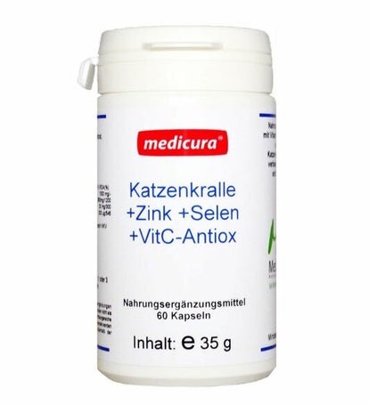Zusammensetzung/Kapsel: Katzenkrallenwurzelextrakt (250mg), Ascorbinsäure (Vit. C) (200mg), Gelatine (mit Farbstoff Titandioxid), Zink als Zinkcitrat (5mg), Selen als Natriumselenat (50µg)