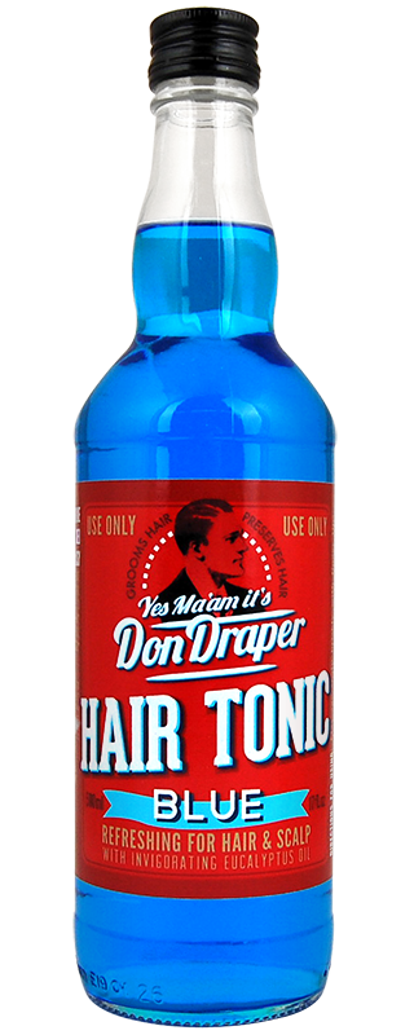 Heute ist es nahezu in Vergessenheit geraten. Doch in den 1920-50er Jahren hatte Hair Tonic den Stellenwert eines Rasierwassers. Ein Hair Tonic stand im Badezimmer, um in der früh noch vor der Rasur den Kopf zu beleben und die Frisur auf die obligatorische Pomade vorzubereiten. In den Barbershops bildete eine Hair Tonic Massage den krönenden Abschluss des Haarschnitts. Und im Sommer boten mit Menthol und Eukalyptus versetzte Hair Tonics - wie Osage Rub, das Don Draper Hair Tonic Blue oder Don Draper Hair Tonic Blue - eine kühlende Erlösung für den Kopf und sogar schmerzlindernde Abhilfe bei Moskitostichen.