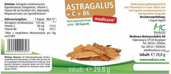 Zusammensetzung/Kapsel: Astragalus membranaceus (125 mg), Kapselmaterial: Hartgelatine, Vitamin C (90 mg), Vitamin B6 (5 mg) als Pyridoxin HCL, Maisstärke, Magnesiumsalze von Speisefettsäuren