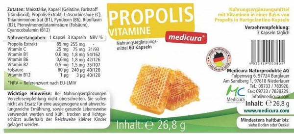 Zusammensetzung/Kapsel: Maisstärke, Kapselmaterial: Hartgelatine (mit Farbstoff Titandioxid), Propolis-Extrakt (85mg), Vitamin C (25mg), Vitamin B1 als Thiaminmononitrat (0,5mg), Vitamin B2 als Riboflavin (0,5mg), Vitamin B6 als Pyridoxin HCL (0,5mg), Folsäure, Vitamin B12