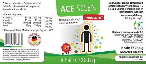 Zusammensetzung/Kapsel: Maisstärke, Kapselmaterial: Hartgelatine, Vitamin C (80mg), Vitamin E dl-a-Tocopherolacetat (15mg), Vitamin A-palmitat (1000µg), Selen als Natriumselenat (50µg)